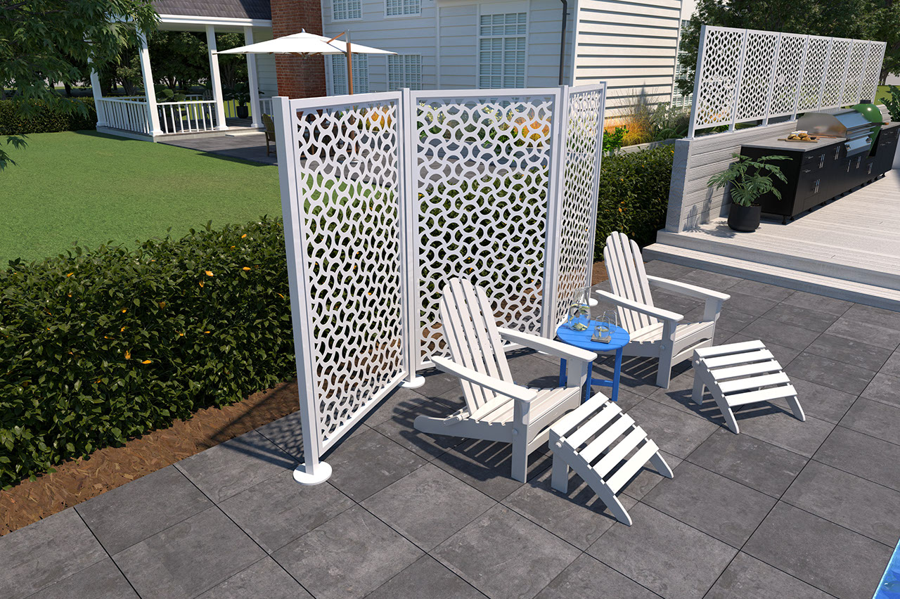 A Trex Privacy é uma nova série de painéis de parede de alumínio elegantes e de baixa manutenção. Oferecidas em opções permanentes e móveis, essas telas decorativas estão disponíveis em vários padrões com uma variedade de opções de cores revestidas a pó para complementar a estética de qualquer ambiente externo. Painéis fixos são oferecidos nos tamanhos 3’x3’ e 6’x3’, e telas móveis de 6’x3’ estão disponíveis com até cinco configurações de painel. Ofertas personalizadas também estão disponíveis para ambas as opções.